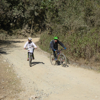 Mal ohne Kultur aber dafür mehr Natur. Der Ultimat Ride to Chitlang! Organisiert von Panc Bike, dem ältesten Fahrradladen Nepals. Ein Tagesausflug ins Nachbartal, der viel Downhill verspricht. Ich leihe für Karun, den ich schon als kleinen Bruder sehe, ein passendes Rad und so ging es im Corso früh zeitig los zur Seilbahn. Normal werden keine Räder damit transportiert und so fand der Lift für fast 150 Teilnehmer vor dem normalem Fahrgastbetrieb statt. Auf rund 2500 Meter Höhe ist der morgendliche Ausblick über des Kathmandu-Tal fantastisch. Dann ging es am Jeep Trail auf der anderen Seite über 1000 Höhenmeter runter zum Stausee. Lustig war, dass Karun noch nie Bodenfrost unter den Füßen hatte, geschweigenden unter den Rädern. Am halben Weg in Chitlang gab es zeitig aber zünftig Mittagessen - Dal Bhat Power! Zurück vom Stausee, ging es meist schiebend nach Chitlang, wo eine verdiente Jause auf uns wartete. Dort wurde dann kurzer Hand ein Bus gechartert und es ging in einer lustigen Fuhre zum Pass hinauf mit anschließendem Downhill in den Sonnenuntergang zurück nach Kathmandu. Ein sehr gelungener Ausflug mit fast 60 Kilometern am Rad und kumulierten 2500 Höhenmeter Downhill.
