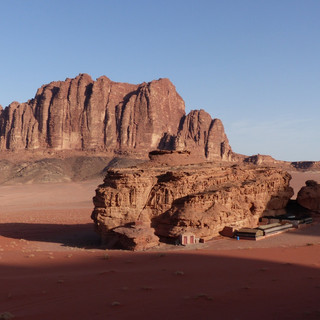 Die Taeler der Wadi Rum liegen so bei rund 1000 Meter und die Sandstein und Granit Massive ragen nochmal 400 - 600 Meter höher in den Himmel. Kommen ein paar kleine Wolken hinzu, ergeben sich wunderschöne Perspektiven und Farbspiele.